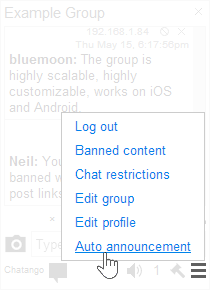 Send a set message in the chat at a specified interval. Log in to your group as the owner. Click the Main menu then choose Auto announcements.