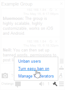 If you are moderating a fast group the easy ban mode allows you to ban a user and delete all their messages with one click. To turn on easy ban you must be the owner or a moderator, click Moderation menu Turn On Easyban.